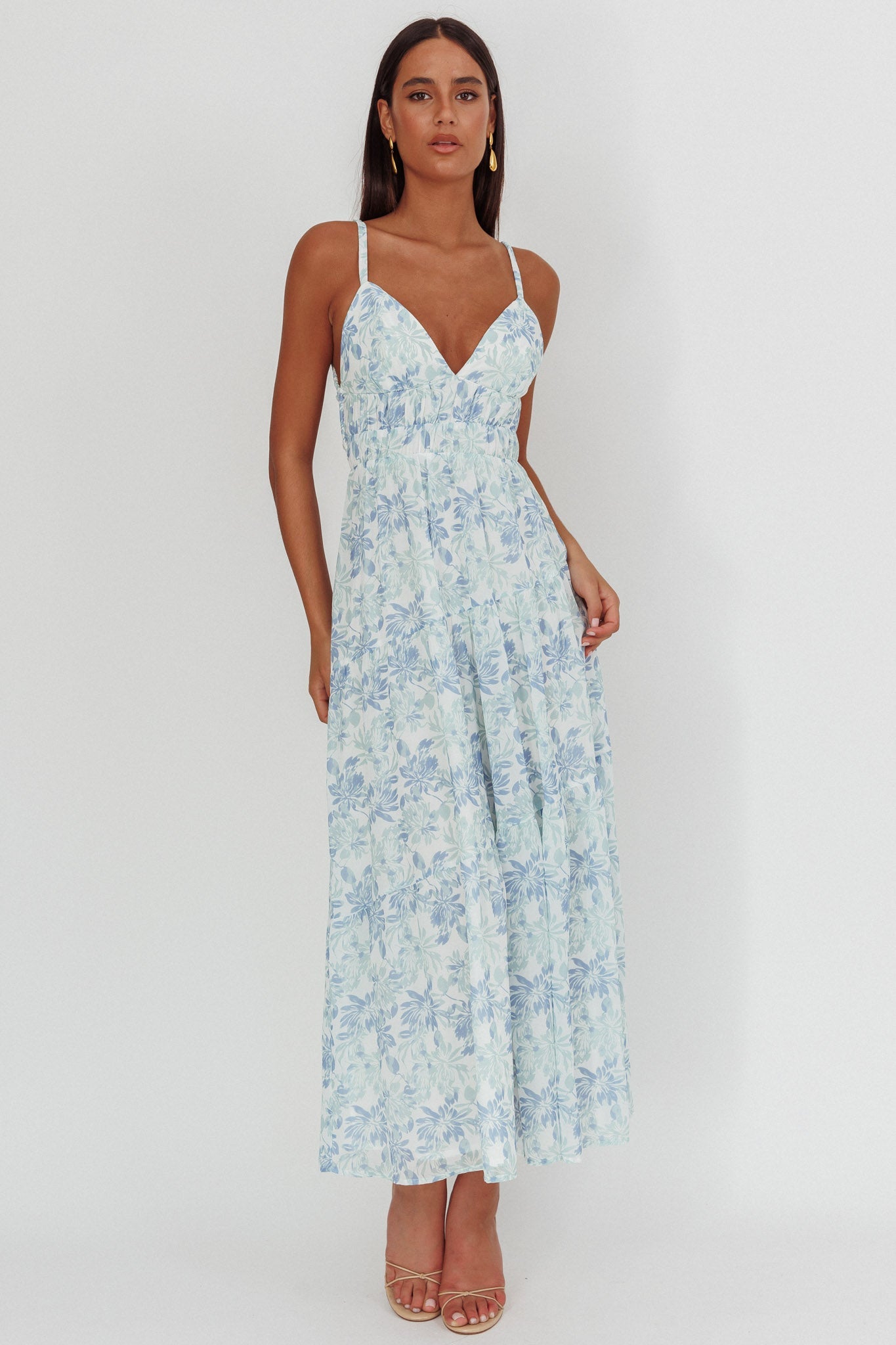 Abito lungo con spalline sulla schiena e stampa floreale blu del Pacifico meridionale