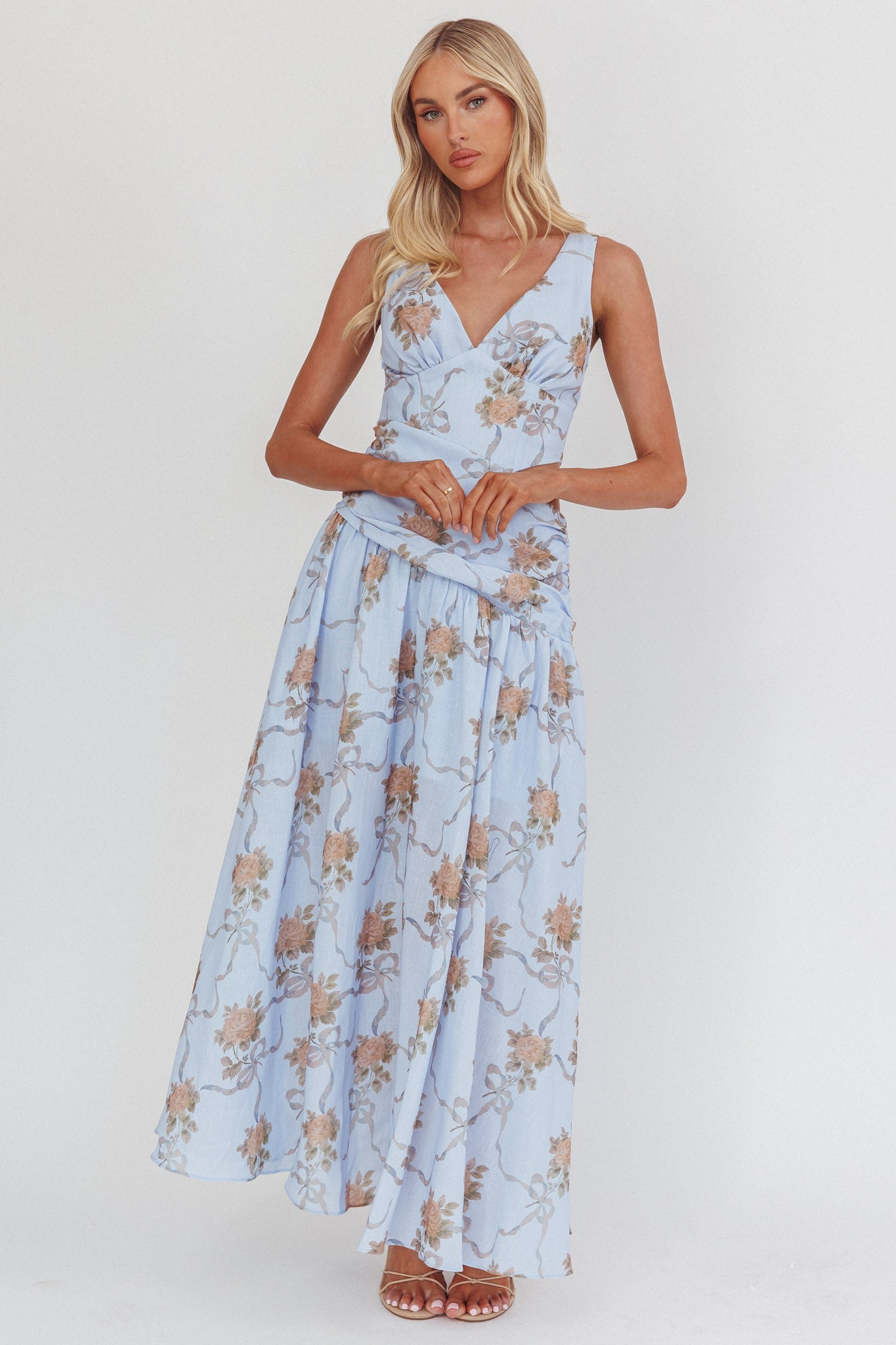 Abito lungo con scollo a V e spacco sul davanti, motivo floreale blu, First Dates