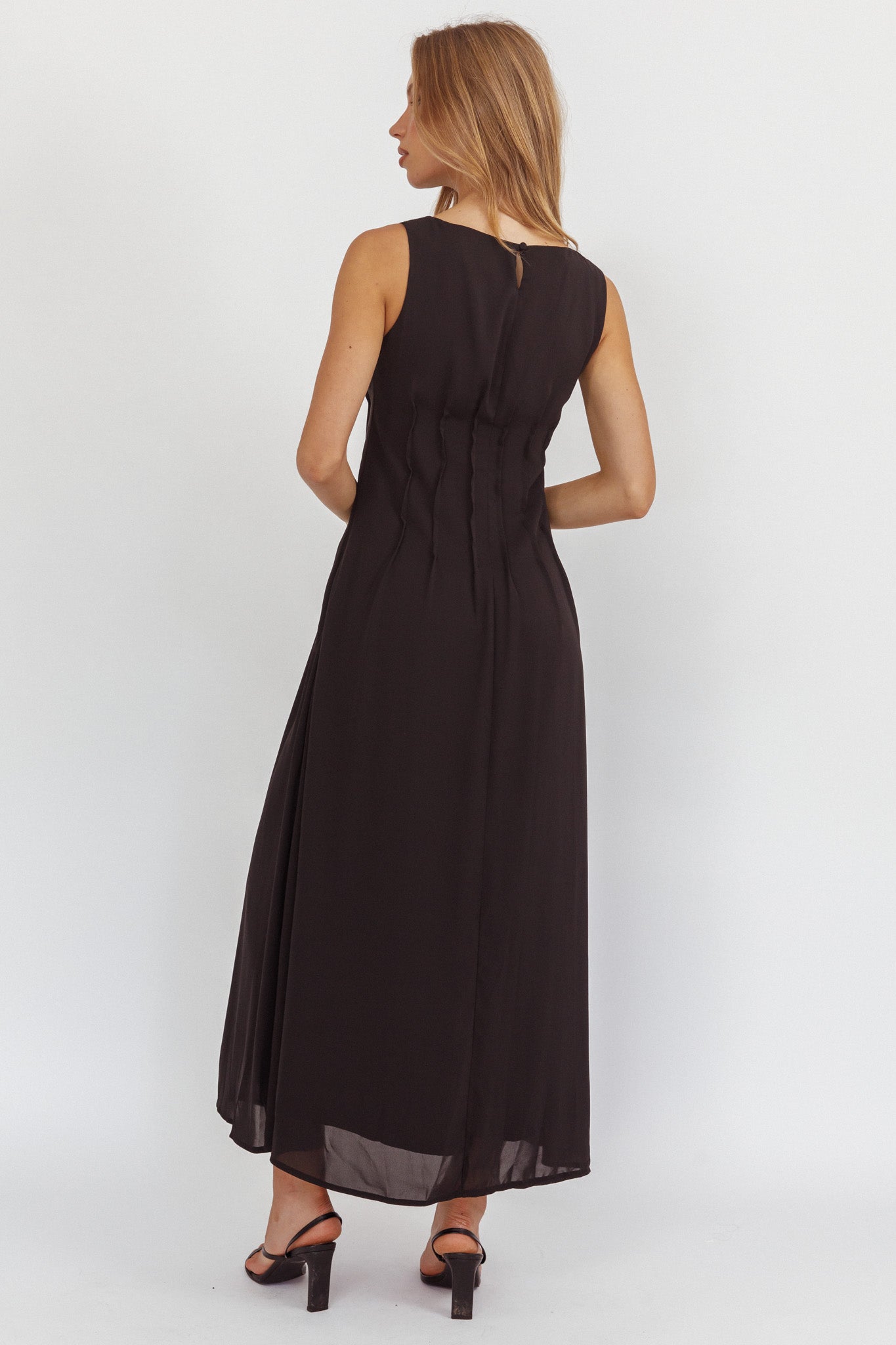 Sarai super chic con il nostro abito lungo Karine. Presenta un design senza maniche con pieghe a pieghe. È perfetto per un caffè nel weekend con le tue amiche, abbinato a sandali e una borsa tote per un look che non passerà inosservato.