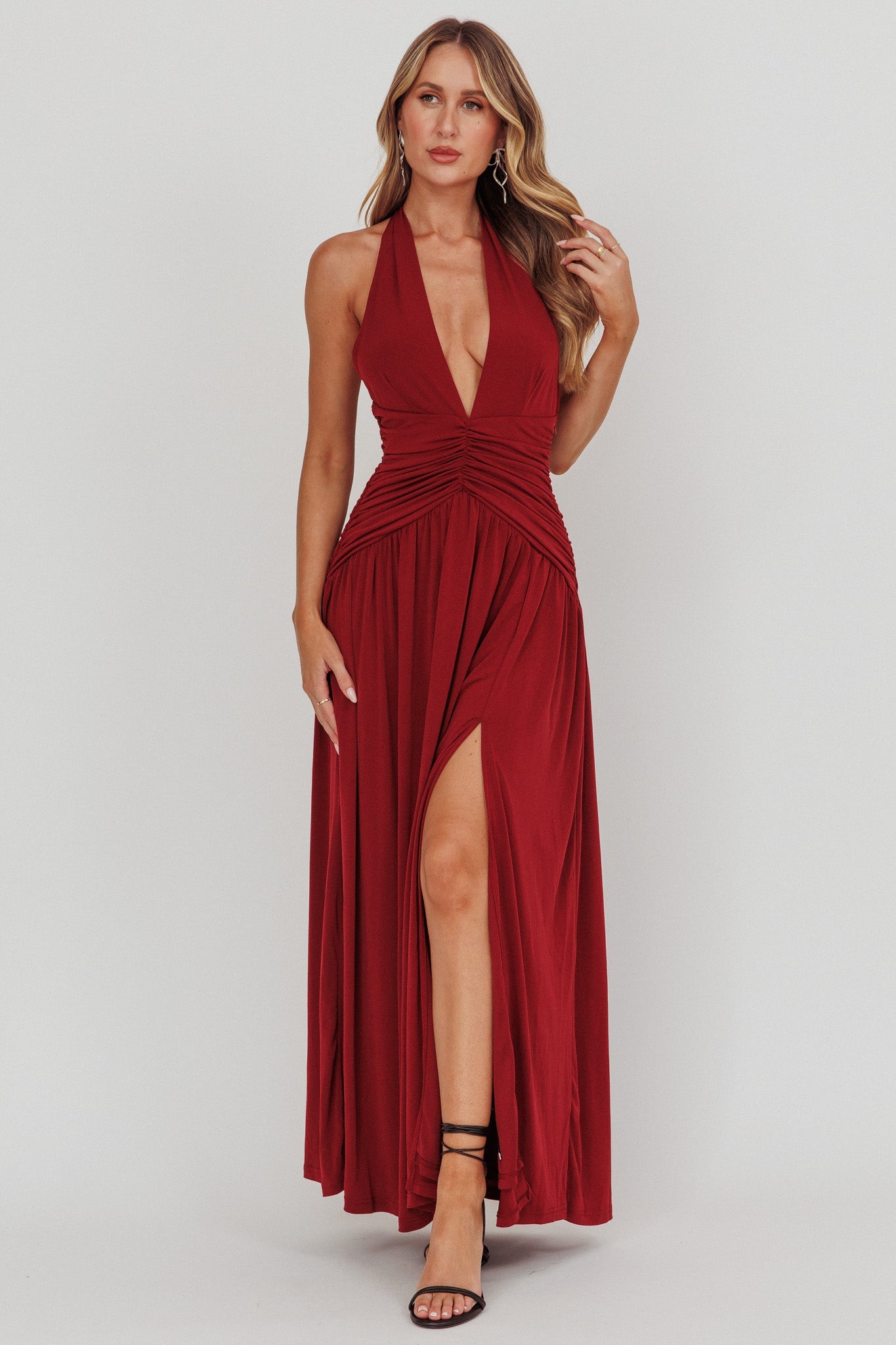 Abito lungo con vita arricciata in azzurro Italia, colore vino