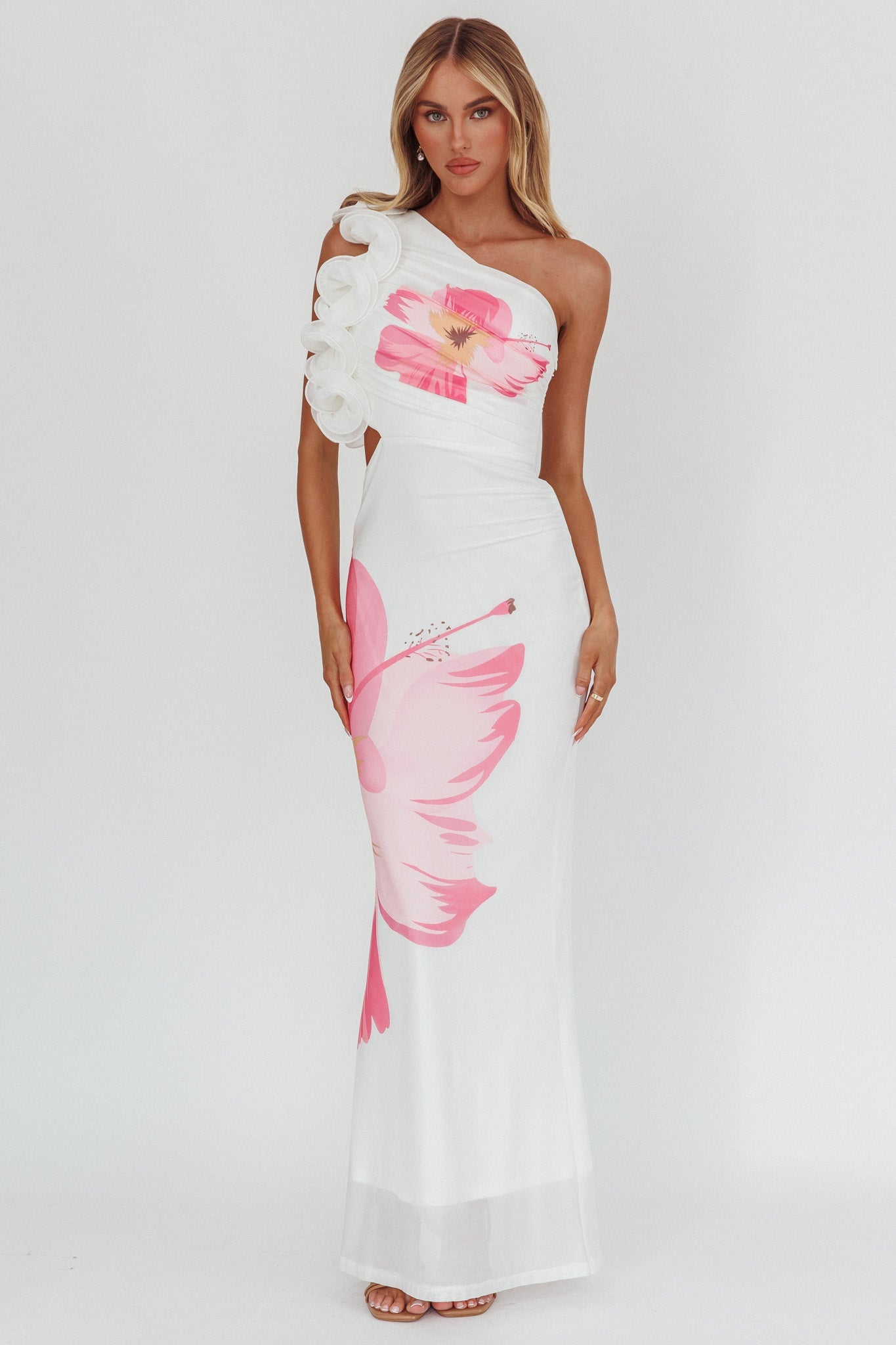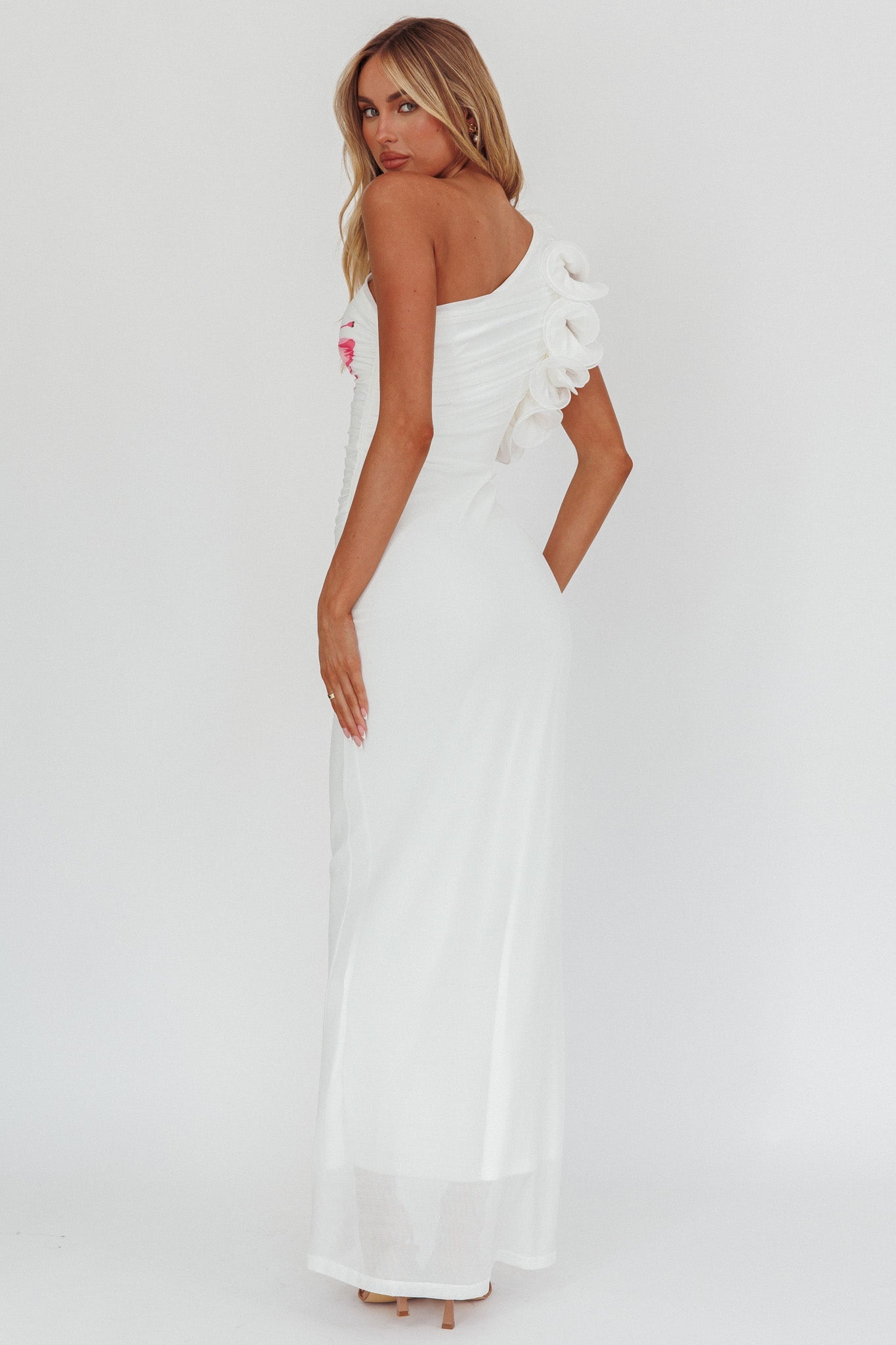 Abito lungo monospalla con volant Deanna, bianco ibisco
