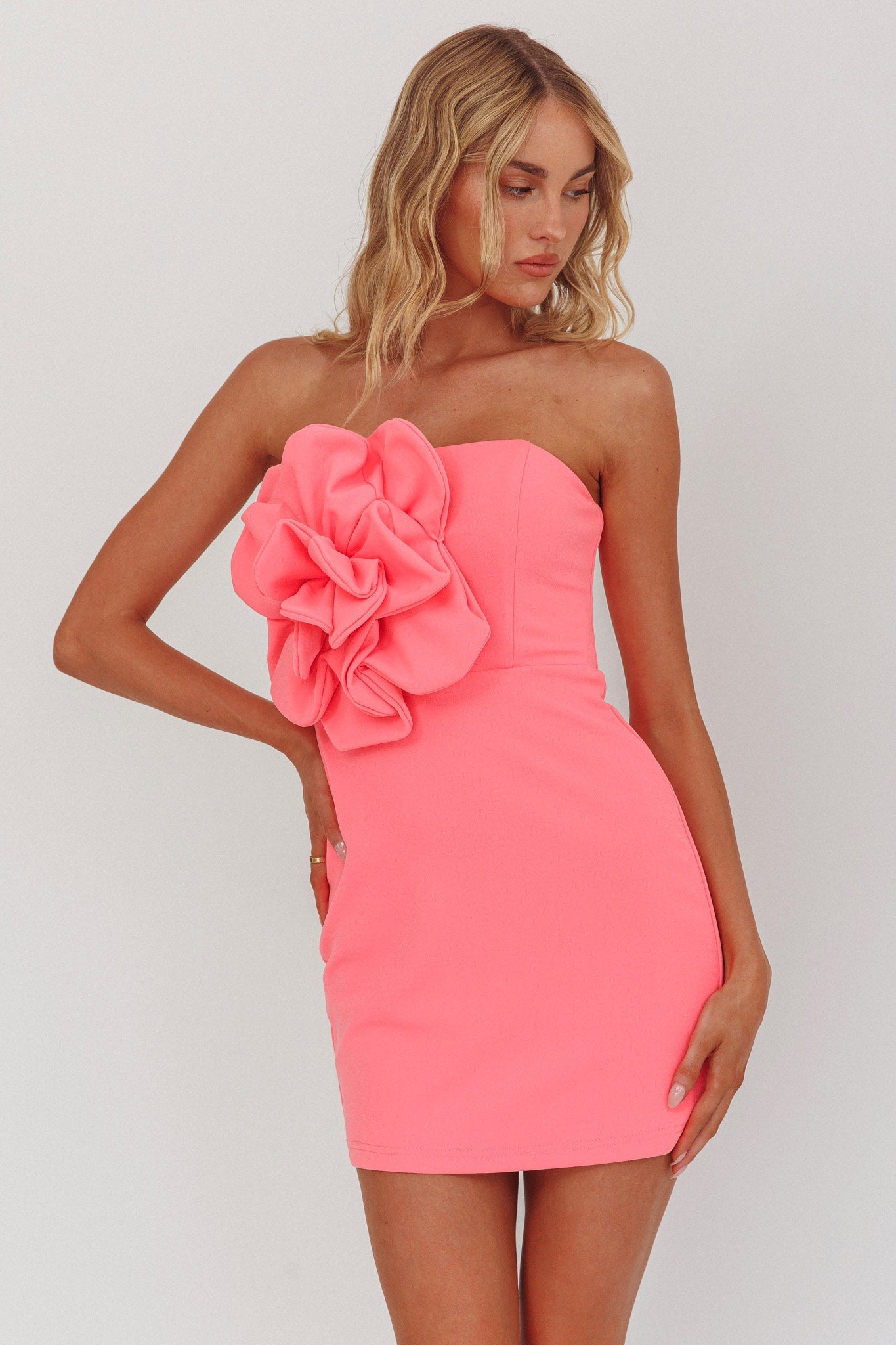 Ruba la scena con il nostro splendido mini abito Karoline. Presenta un'elegante decorazione floreale 3D sul corpetto e un design senza spalline. È proprio quello che stavi cercando per il ballo di fine anno o per la tua grande festa di compleanno. Abbinalo a tacchi con cinturino e allacciatura e una pochette per un look indimenticabile.