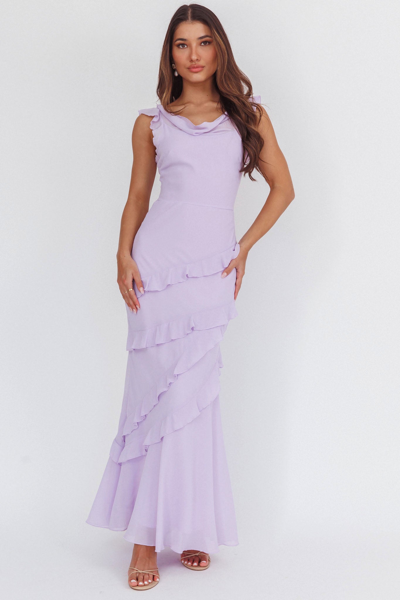 Abito lungo con volant e scollo a cappuccio Sangria Lilla