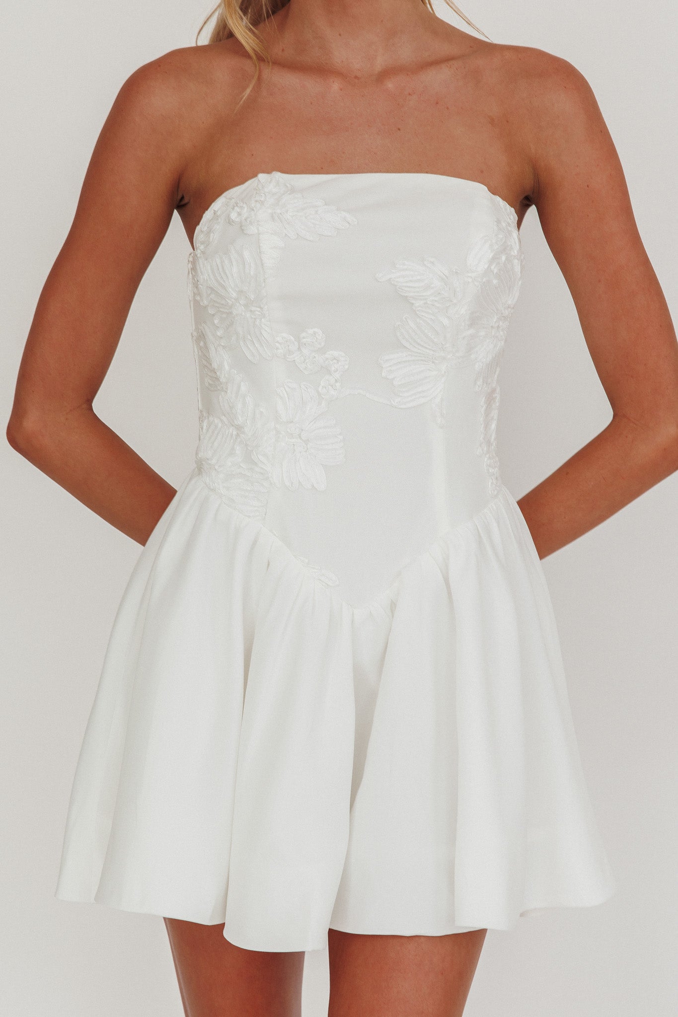 Fai colpo con il nostro splendido miniabito Fiora. Presenta un design senza spalline con un'elegante vita baschina. È proprio quello che ti serve per un cocktail del venerdì sera con le tue migliori amiche. Abbinalo a tacchi con cinturino e una tote bag per un look che non passerà inosservato.