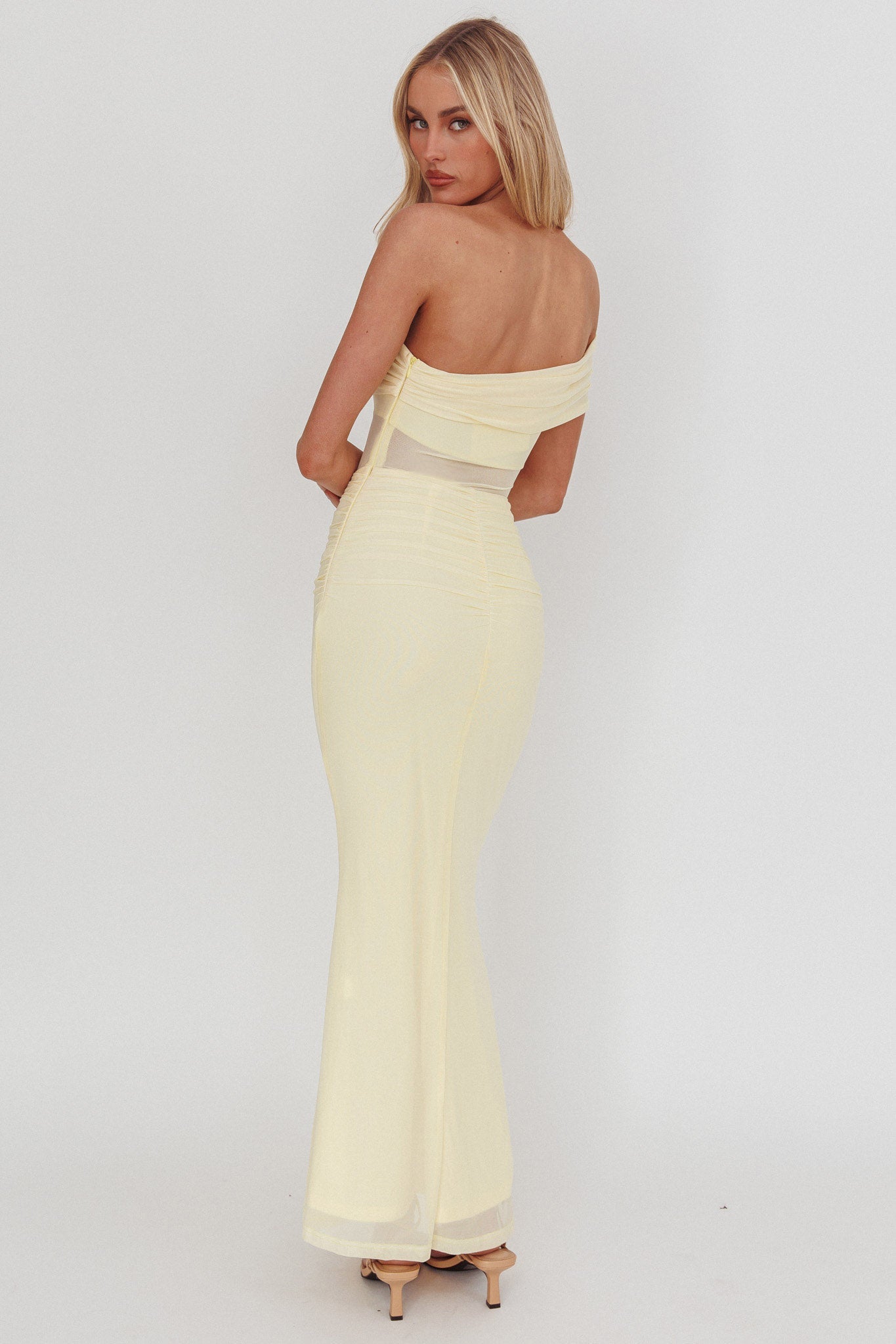 Abito lungo monospalla con vita trasparente Gala giallo