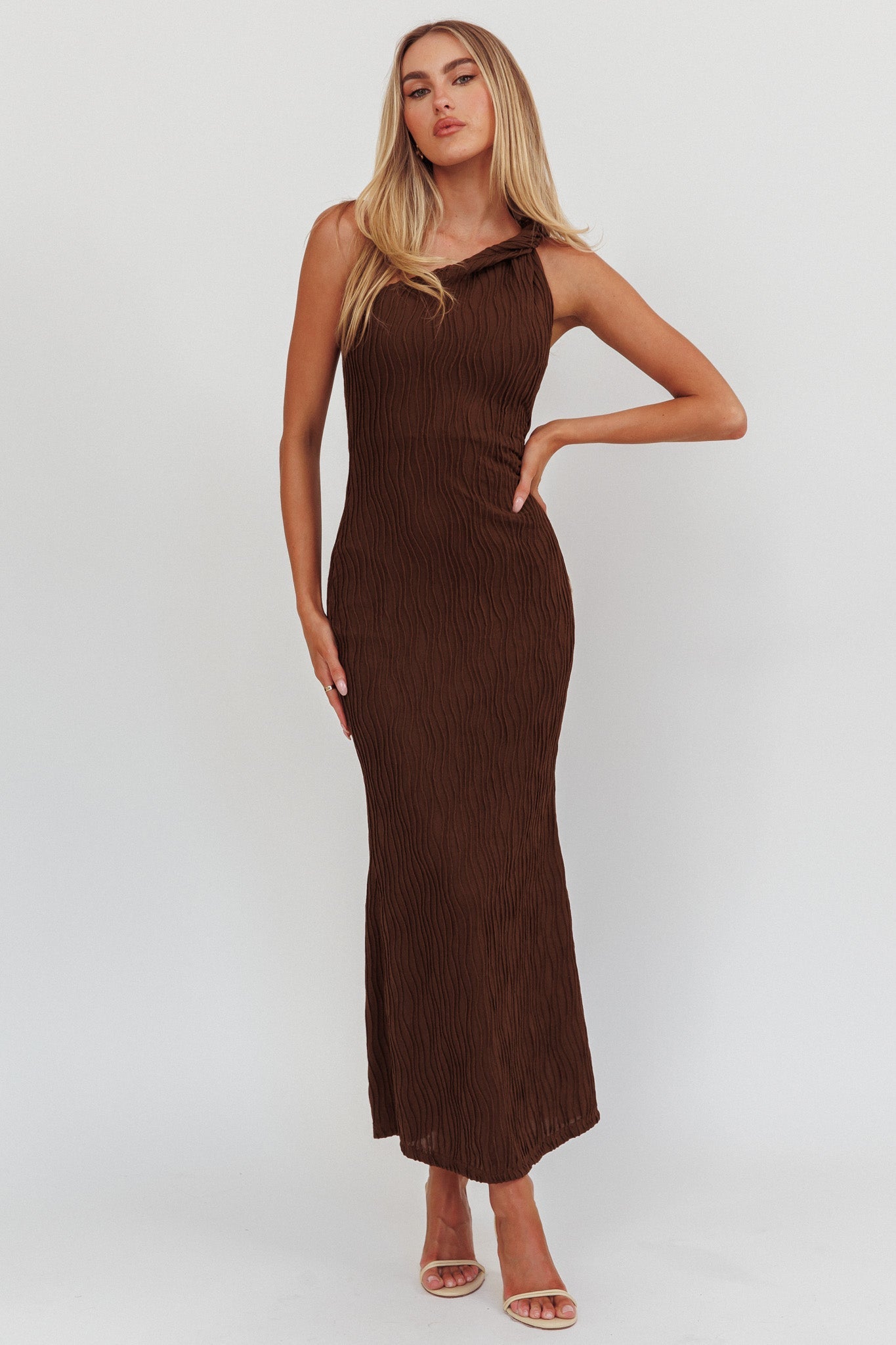 Abito lungo monospalla intrecciato Lingering Love Cioccolato